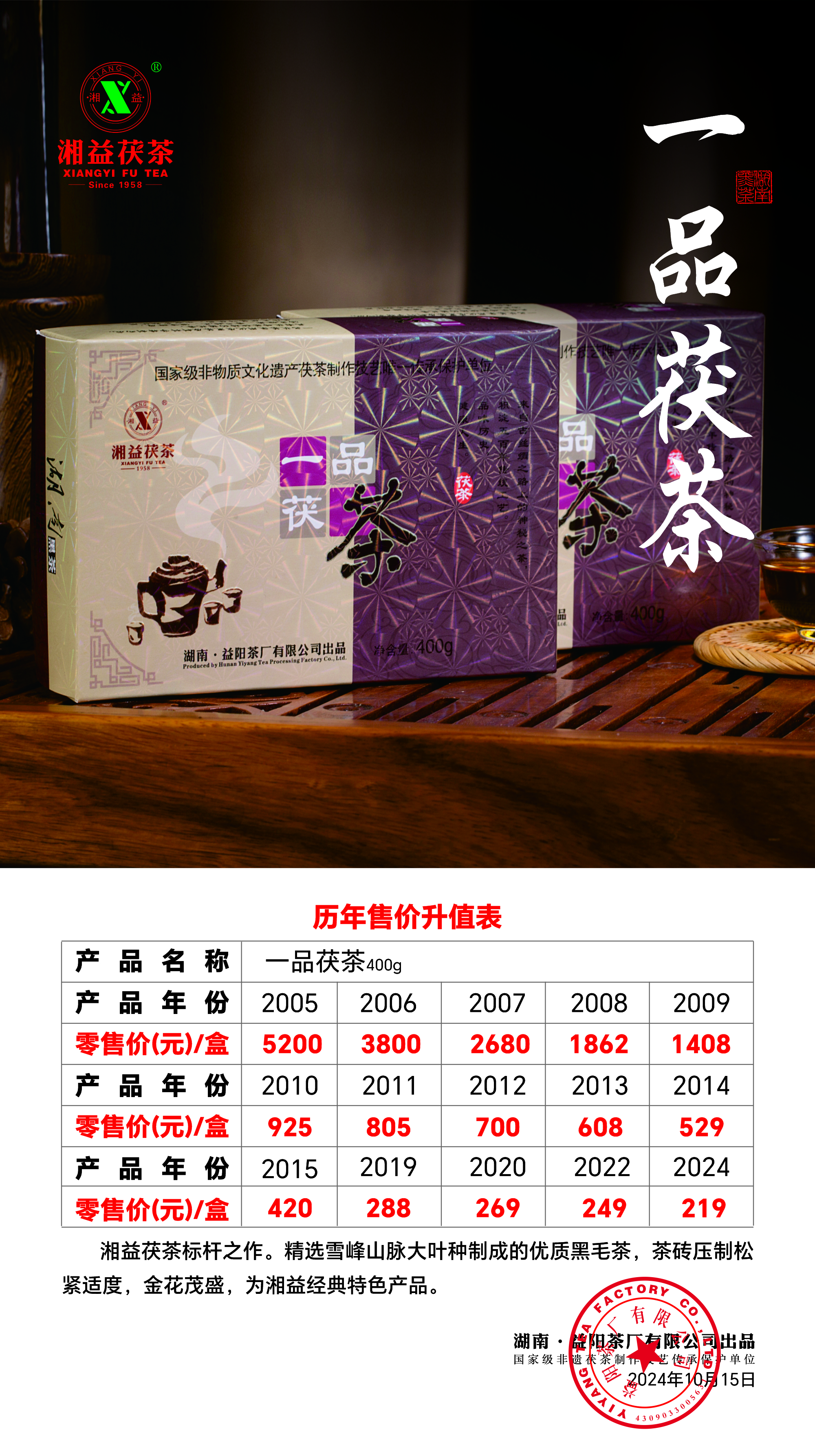 產品名稱:一品茯茶 包裝規(guī)格:400g/盒x30盒/件 全國統(tǒng)一零售價:219元/盒(限當年)