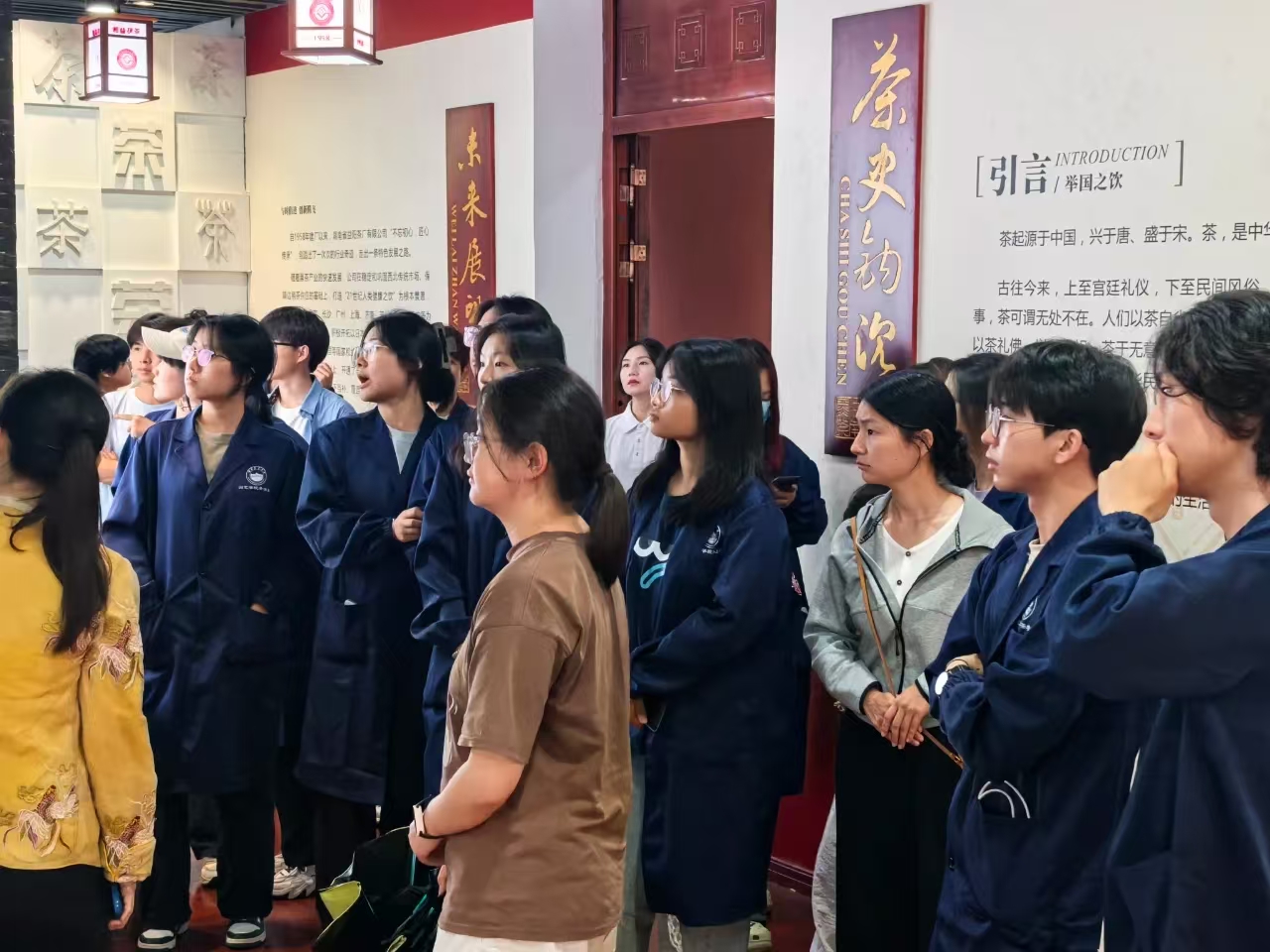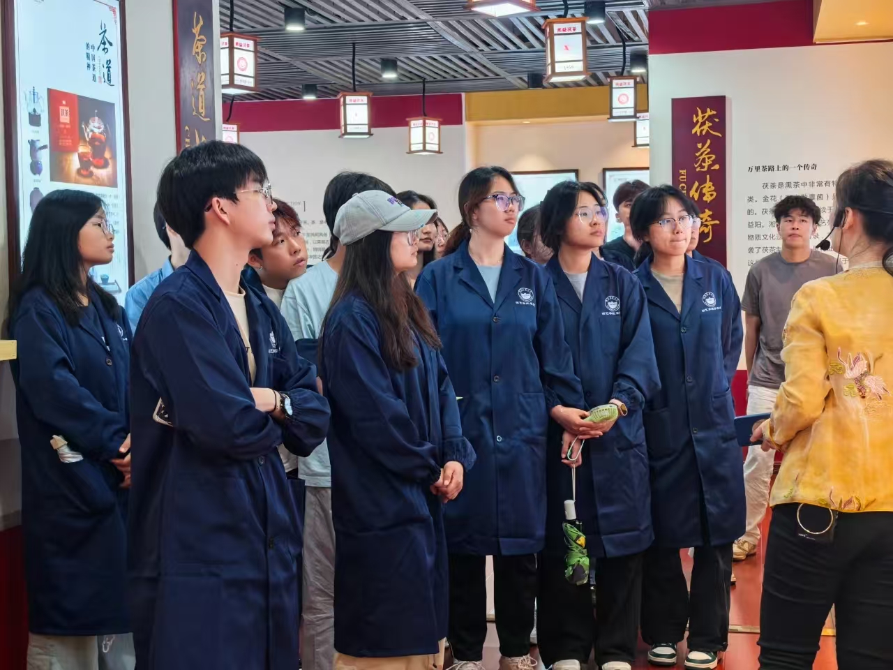 師生們首先實(shí)地參觀了湘益生產(chǎn)線與茶博館。在生產(chǎn)車間,同學(xué)們親身感受益陽茶廠標(biāo)準(zhǔn)化、現(xiàn)代化的生產(chǎn)流程,對(duì)茯磚茶的制作工藝有了初步直觀的了解。茶博館內(nèi)陳列的一件件展品,則如同一部生動(dòng)的茶文化史書,讓師生們沉浸式領(lǐng)略益陽茶廠深厚的文化底蘊(yùn),探尋茯茶的前世今生,深刻體會(huì) “一片茶葉承載的使命”。